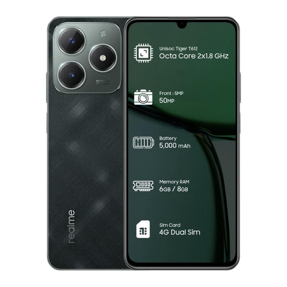 هاتف Realme C61 ، كابل USB Type-C، محول طاقة، دليل المستخدم، دبوس الشريحة، غطاء ولاصق حماية، وبطاقة الضمان