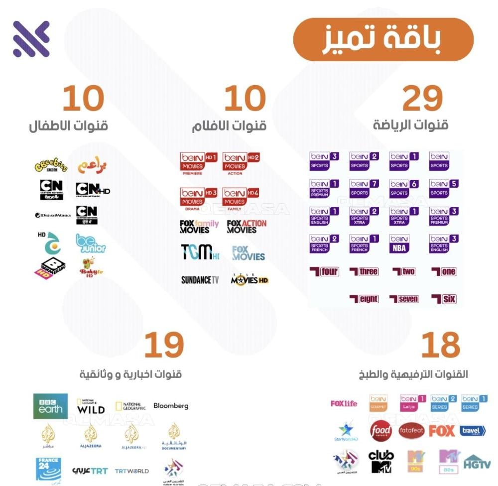 • جميع قنوات الرياضة والأفلام والأطفال والمسلسلات والوثائقيات
