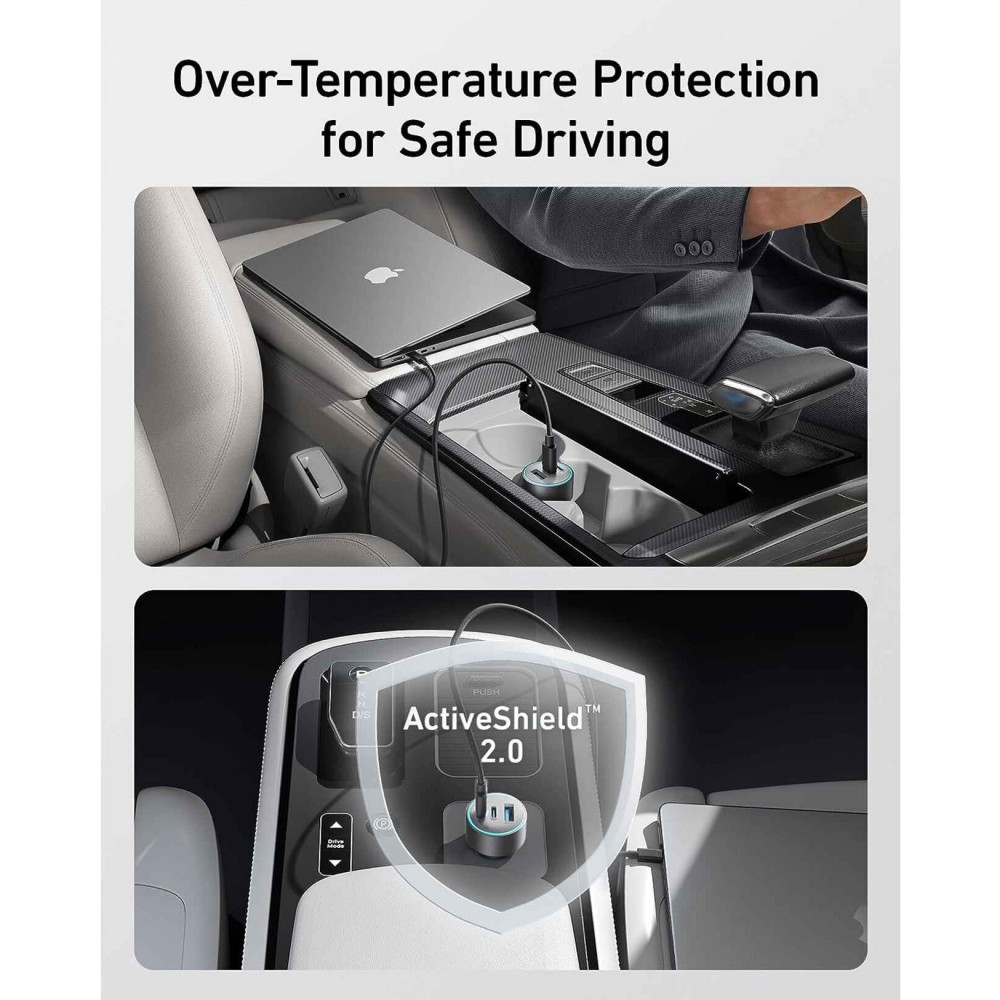 سهل التنقل ولا ياخذ مساحة في السيارة وايضا يوجد به ميزة مراقبة الحرارة الذكية اللي تمنع ارتفاع حرارة الشاحن بشكل متواصل.