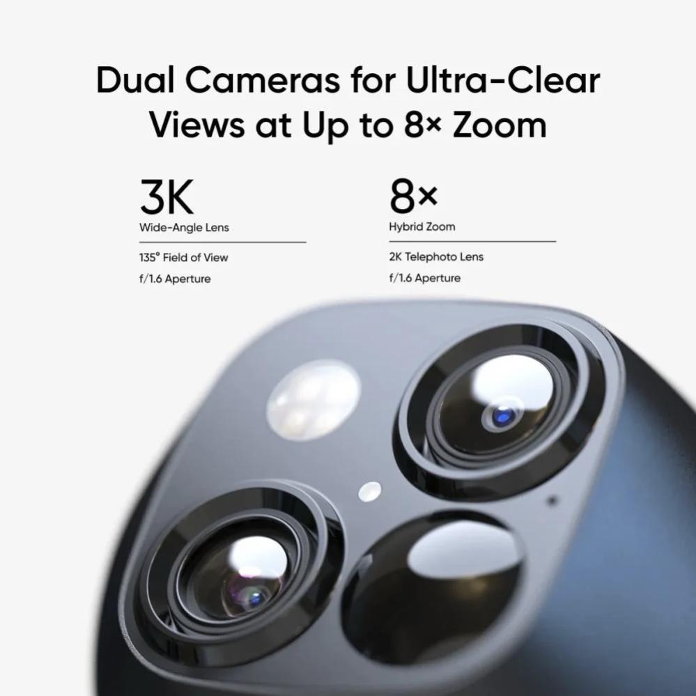 توفر الكاميرا وضوحًا محسنًا بفضل نظام الكاميرا المزدوجة، مما يتيح التقاط كل حدث حول منزلك بدقة 3K فائقة الوضوح، مع تكبير يصل إلى 8× لرؤية التفاصيل بوضوح حتى مسافة 50 قدمًا.