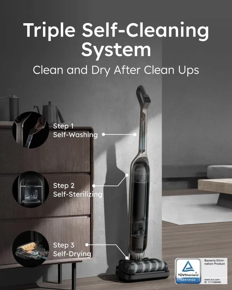 تقوم بتنظيف نفسها أثناء تنظيف الأرضيات مع نظام التنظيف الذاتي الثلاثي يمكنك ان تحدد وضع التنظيف الذاتي لغسل الفرشاة الدوارة جيدًا بسائل التنظيف بعد عمليات التنظيف ، بينما يقلل الأوزون المائي من الروائح والجراثيم. يتم توزيع الهواء الساخن للتأكد من أنه جاف تمامًا وجاهز للتنظيف التالي. ويتم الخلط بدون استخدام اليدين يخلط الماء ومحلول التنظيف تلقائيًا بنسب مثالية